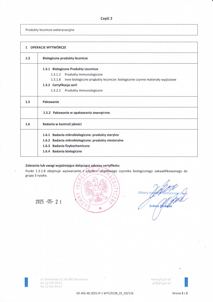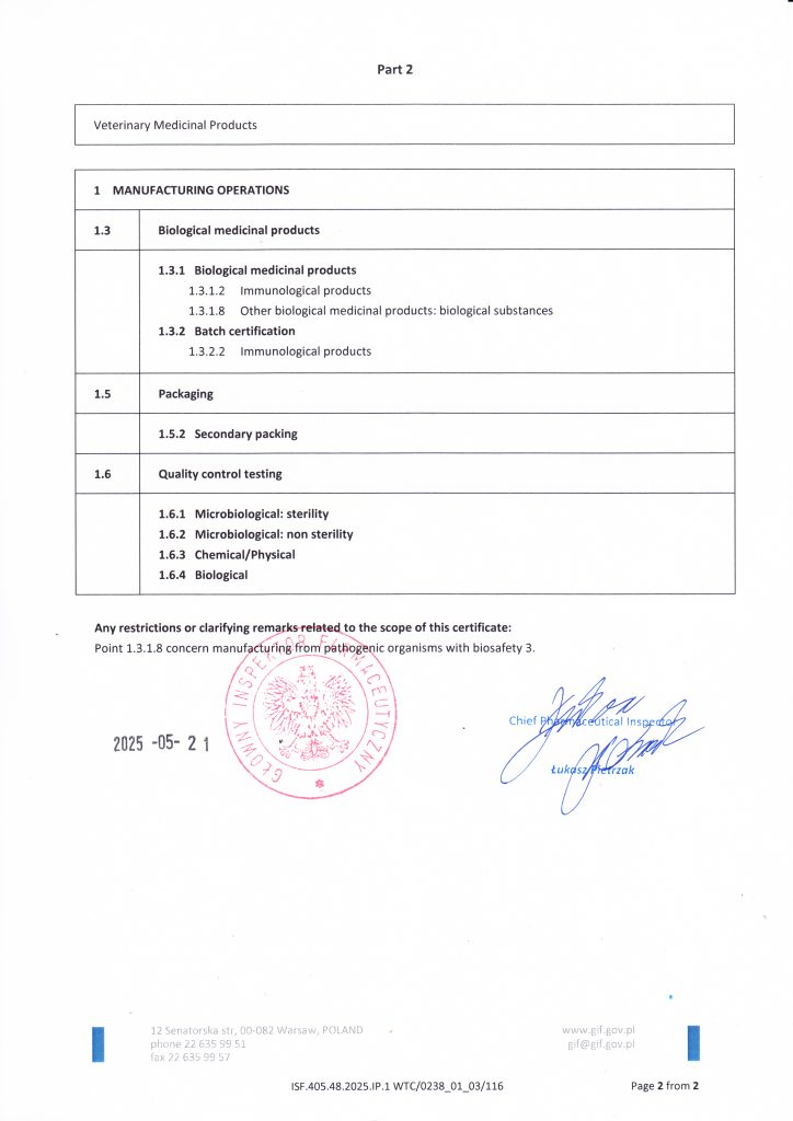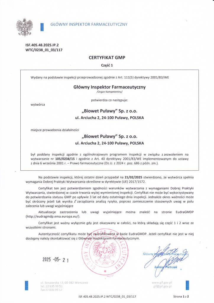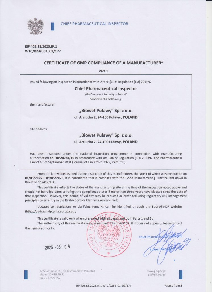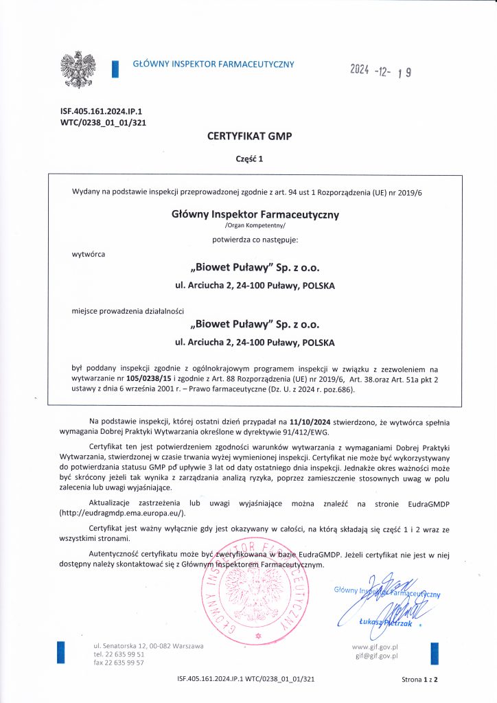 Biowet Puławy posiada certyfikaty GMP obejmujące wytwarzanie produktów sterylnych w postaci płynnej oraz produktów niesterylnych, w tym płynów, proszków, pasków do zawieszania w ulu i tabletek. Zakres certyfikacji obejmuje również biologiczne produkty lecznicze, w tym produkty immunologiczne, a także prowadzenie badań biologicznych w Dziale Kontroli Jakości.