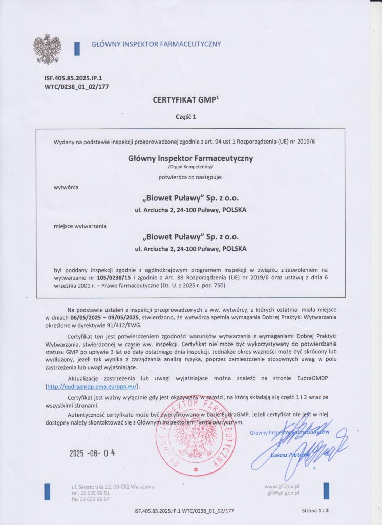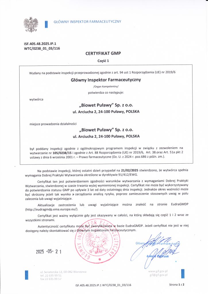 W firmie Biowet Puławy Sp. z o.o. procesy wytwarzania prowadzone są zgodnie z wymaganiami Dobrej Praktyki Wytwarzania (GMP), wynikającymi z przepisów Prawa farmaceutycznego oraz Dyrektyw Europejskich. Produkty lecznicze powstają w kontrolowanych warunkach, z wykorzystaniem odpowiedniej aparatury, a ich przebieg nadzoruje wykwalifikowany personel.