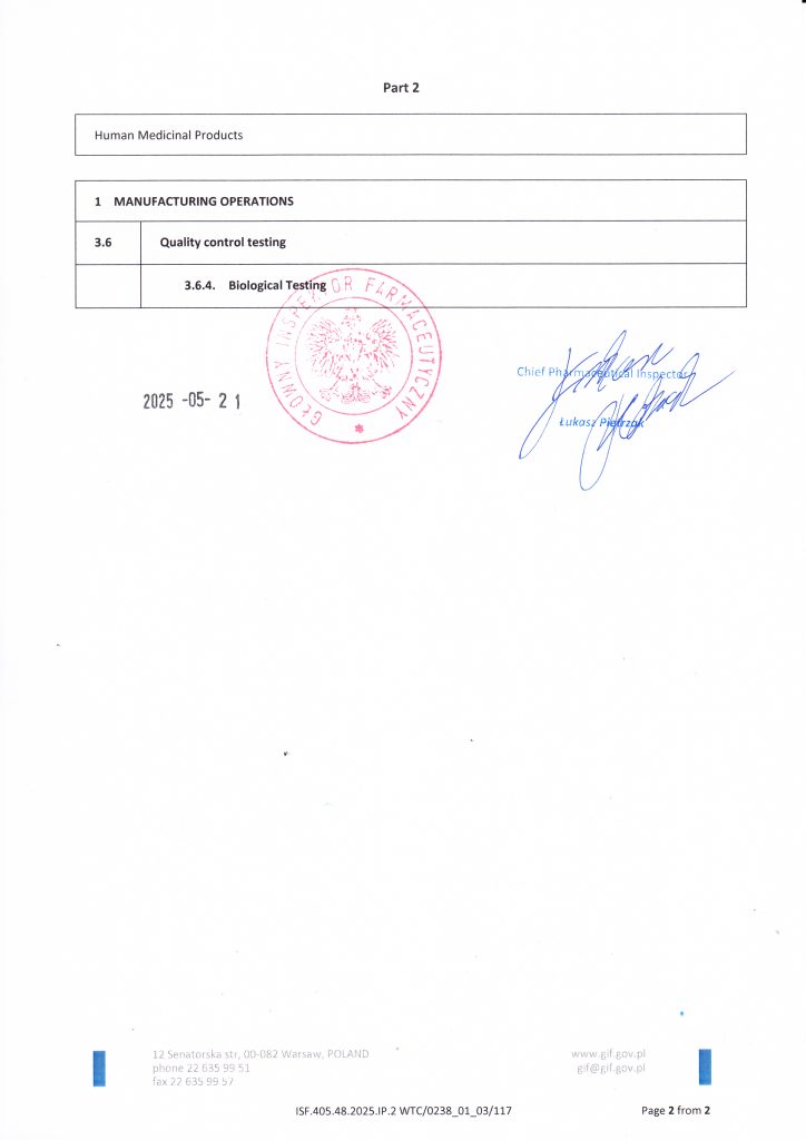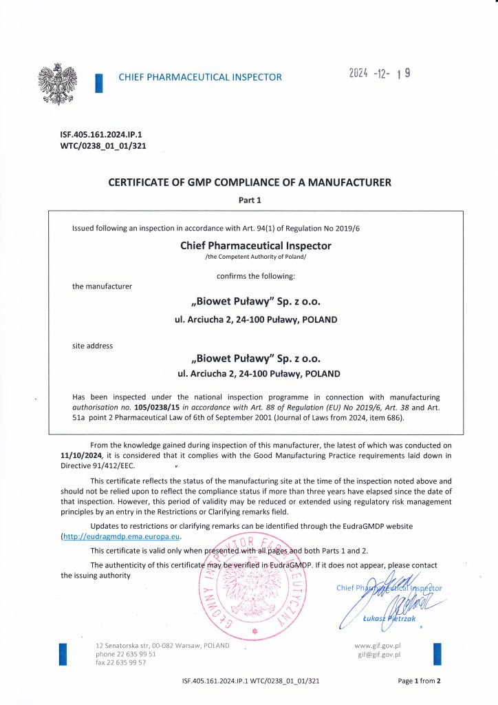 Biowet Puławy holds GMP certificates covering the production of sterile liquid products and non-sterile products, including liquids, powders, hive strips and tablets. The scope of certification also includes biological medicinal products, including immunological products, as well as the conduct of biological testing in the Quality Control Department.