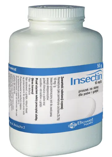 Insectin is intended for the control of ectoparasite infestations: fleas and ticks in dogs, as well as lice and soft ticks in pigeons.