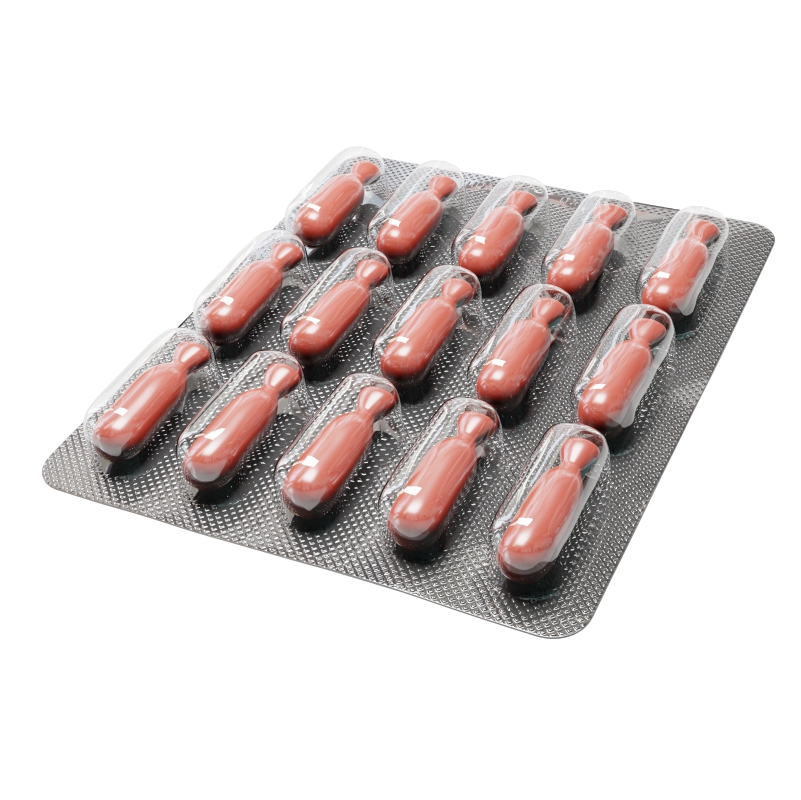 Capsule shell ingredients: pork gelatin, glycerol E422, sensory additive: E172 / red iron oxide