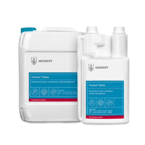 Viruton Extra to wydajny, enzymatyczny koncentrat przeznaczony do jednoczesnego mycia i dezynfekcji instrumentówchirurgicznych i rotacyjnych. Zawiera enzym – proteazę, dzięki czemu wykazuje bardzo dobre właściwości czyszczące. Skutecznieusuwa zaschnięte zabrudzenia organiczne. Przeznaczony jest do manualnej dezynfekcji narzędzi oraz dezynfekcji w myjkachultradźwiękowych. Produkt wykazuje właściwości antykorozyjne i wysoką tolerancję materiałową. Jest zalecany do instrumentów zestali szlachetnej, niklu, miedzi, aluminium, gumy, porcelany, szkła i tworzywa sztucznego. Dzięki innowacyjnej formule opartej nasynergii surfaktanów i technologii nano-miceli produkt posiada szerokie spektrum bójcze i wyjątkowe właściwości myjące.
