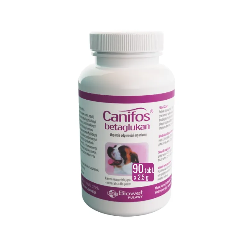 Canifos betaglukan рекомендований для реабілітації тварин, ослаблених після хвороби, під час антибіотикотерапії, під час вагітності та лактації, у стресових ситуаціях (виставки, подорожі) і літніх тварин.